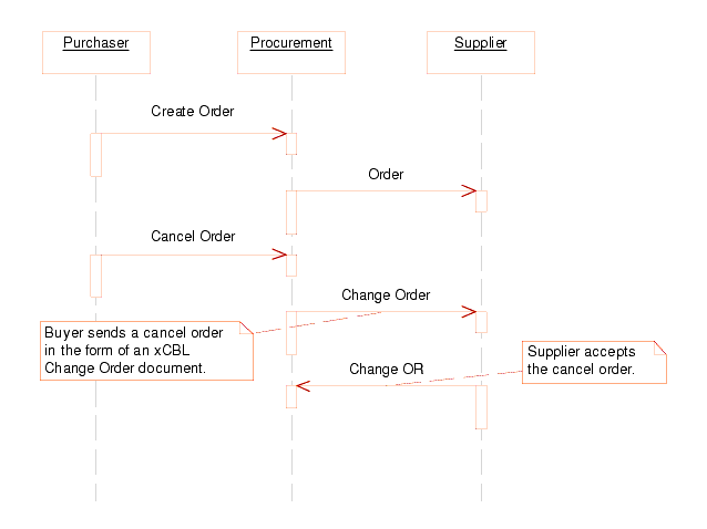 Description: The buyer sends an order to the supplier. Before the supplier responds, the buyer cancels the order and Procurement sends the cancel request in a Change Order document. The supplier then accepts the cancel order request and sends back a change order response.