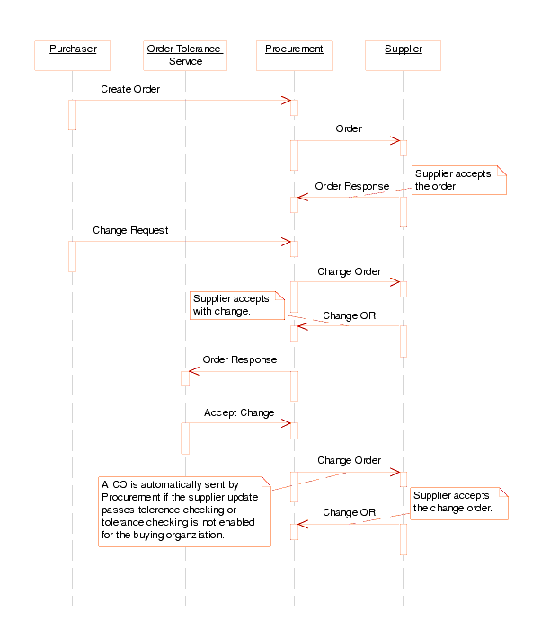 Shortly after Procurement receives the response to the change order, the Order Tolerance service processes the response. The service checks the supplier changes against the tolerance rules setup for the supplier at the buying organization's supplier option level. In this case, the changes were within the tolerance levels of the system. Therefore, the order is updated with the change order information. The update includes the buyer changes on the outgoing change order and the supplier changes on the response to the change order.