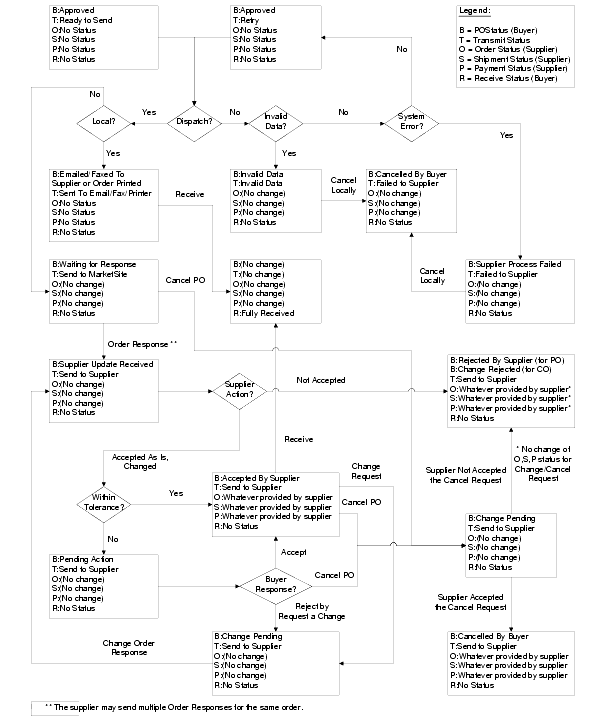 After an order is created it is dispatched to a supplier contact via email, an internal contact via email, to FAX or to MarketSite. The dispatch method is configurable for each supplier at the buying organization level. Once the order is dispatched, it may take several different paths depending on the subsequent buyer and supplier actions. The Supported Choreographies and Business Scenarios sections of this document are dedicated to describing the valid state transitions.